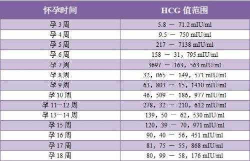 hcg参考值:孕:3--4周:9--30 (mIU/ml);孕4--5周:75--2600;孕5--6周:850--208003;孕6--7周:4000--00200;孕7--2周:500--289000;孕2--6周:8300--37000;孕6--29周:400--53000;孕29--4周:940--60000。怀孕天数是从末次月经第一天开始计算。