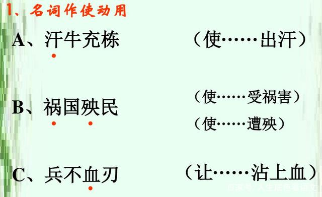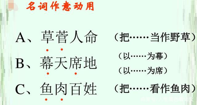 以上常用的两种活用法出现频率较高,其它活用法也偶尔被考到,如: 形容词的意动用法(心乐之,以…… 为乐) 动词的使动用法(今公生之,使……活。好之则亡其国,使……灭亡) 动词的为动用法(此悉贞良死节之臣,为……而死)