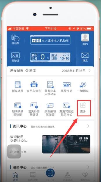 首先打开交管12123手机端,在首页点击【更多】