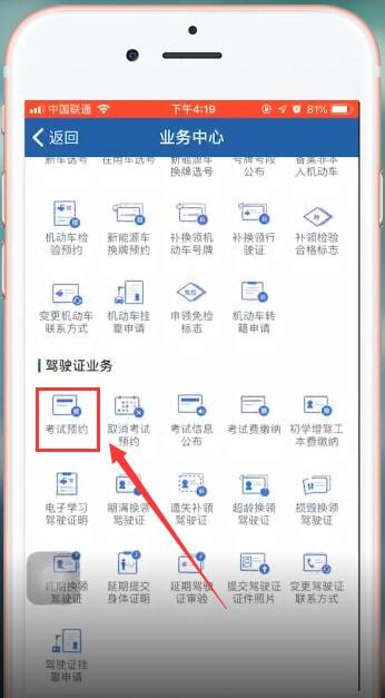 然后进入业务中心后,在驾驶证业务栏可以看到【考试预约】,如果通过考试就会显示【该科目已考试合格,无需预约】。