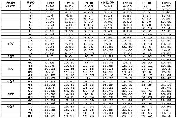 这是儿童标准身高体重表格,家长可以对照表格,检查下自己家的孩子是否超重或者矮小。