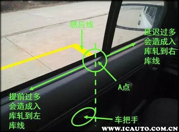 开始缓慢倒车,向左扭头,观察左车窗外感应线的位置,当感应线与车窗下沿的交点到达A点时,向右打死方向盘。