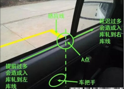 如上图所示,挂倒挡开始进行倒车操作,首先要稳住车速,让车辆缓慢倒车,然后向左扭头观察车身与感应线的位置,当看到感应线和车床下沿的交点到达A点的时候,就要迅速的将方向盘向右边打死,注意这个时候如果打晚或者打早会导致车身入库时压线。
