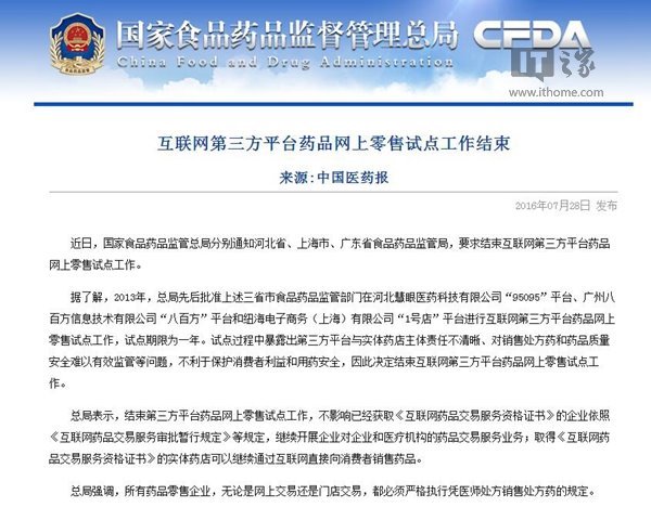 当时国家食药监总局网站上转载了来自中国医药报的一篇报道,表示要求结束互联网第三方平台药品网上零售试点工作。