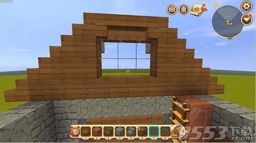 第三步,我们用石砖来做墙壁,这里注意一下窗户上方用的是楼梯倒放,看上去像有窗框比较好看。